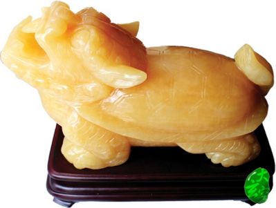 霸下,又名赑屓,形似龜,是老六,平生好負(fù)重,力大無窮,碑座下的龜趺是其遺像。傳說霸下上古時代常馱著三山五岳,在江河湖海里興風(fēng)作浪,后來大禹治水時收服了它,它服從大禹的指揮,扒山挖溝,疏遍河道,為治水作出了貢獻(xiàn)。洪水治服了,大禹擔(dān)心霸下又到處撒野,便搬來頂天立地的特大石碑,上面刻上霸下治水的功跡,叫霸下馱著,沉重的石碑壓得它不能隨便行走。霸下和龜十分相似,但細(xì)看卻有著差異,霸下有一排牙齒,而龜類卻沒有,霸下和龜類在背甲上甲片的數(shù)目和形狀也有差異。霸下又稱神龜,是長壽和吉祥的象征。它總是吃力地向前昂著頭,四只腳下下拼命地?fù)沃瑨暝蚯白?,但總是移不開步。我國一些顯赫石碑的基座都是由霸下馱著,在碑林和一些古跡勝地中都可以看到。在大玄空風(fēng)水上是可以化解內(nèi)六事煞氣,命局缺水的可以運用其補(bǔ)水。